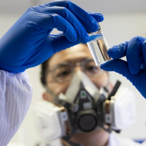 赵苗博士在上海光机所材料实验室内观察实验材料(2月29日摄)。