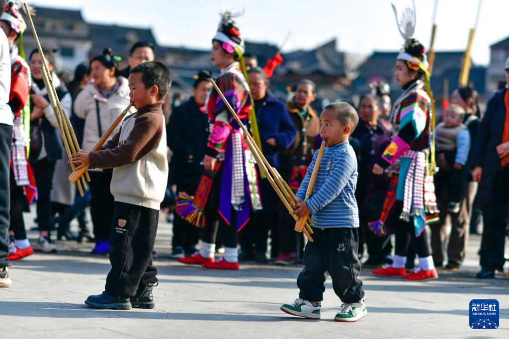 3月2日,在贵州省凯里市舟溪镇,小朋友在吹奏芦笙。