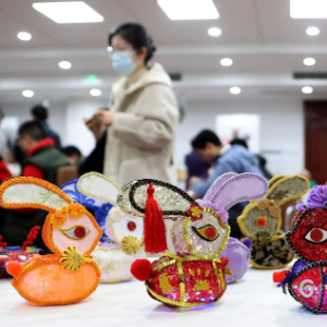 3月6日在巾帼园的非遗好物市集上拍摄的手工兔子灯。