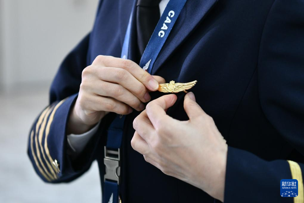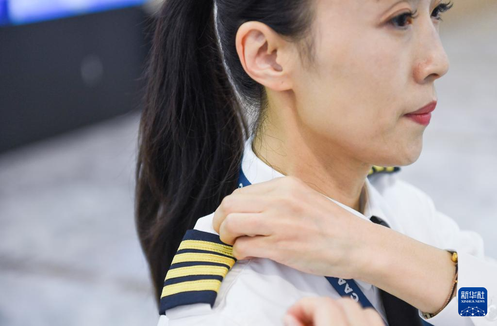 在中国南方航空深圳分公司运行保障综合楼的飞行协作室,机长徐砚秀在前往停机坪前整理肩章(3月5日摄)。