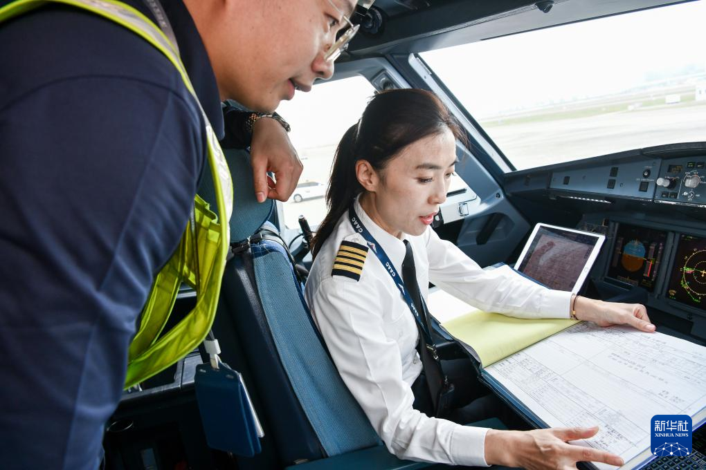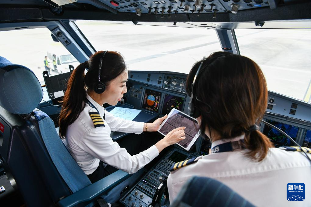 徐砚秀(左)和刘洢含在CZ8205次航班驾驶舱做飞行前的准备工作(3月5日摄)。