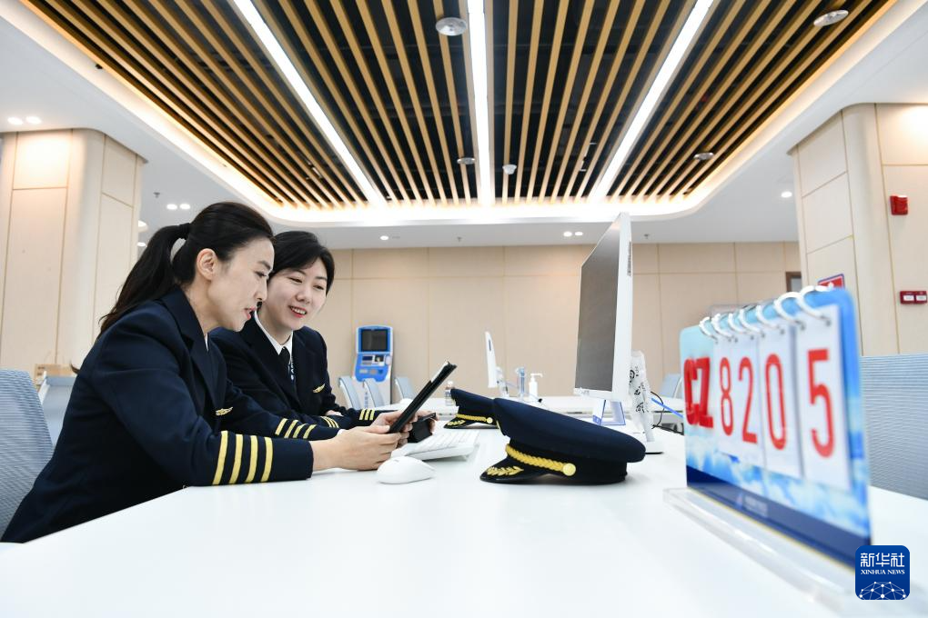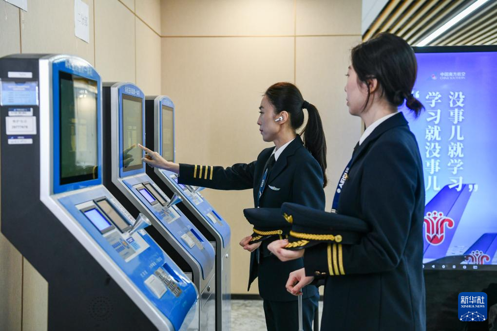 在中国南方航空深圳分公司运行保障综合楼飞行协作室,徐砚秀(左)和刘洢含在签到酒测一体机前进行飞行前的签到和酒测(3月5日摄)。