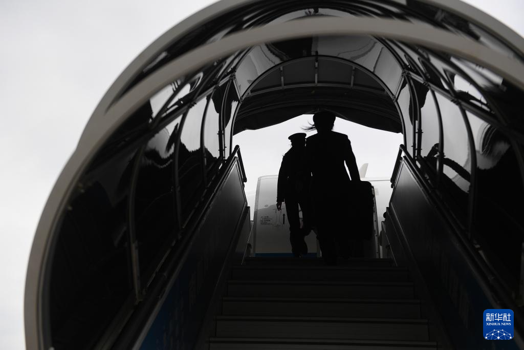 在深圳宝安国际机场,机长徐砚秀(前)和副驾驶刘洢含通过客梯车登机(3月5日摄)。
