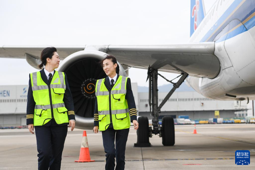 在深圳宝安国际机场的停机坪,机长徐砚秀(右)和副驾驶刘洢含绕机检查后交流(3月5日摄)。