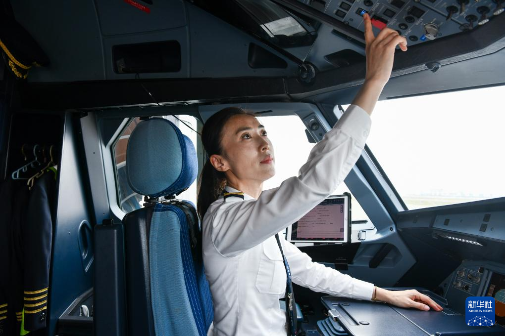徐砚秀在CZ8205次航班驾驶舱做飞行前的准备工作(3月5日摄)。