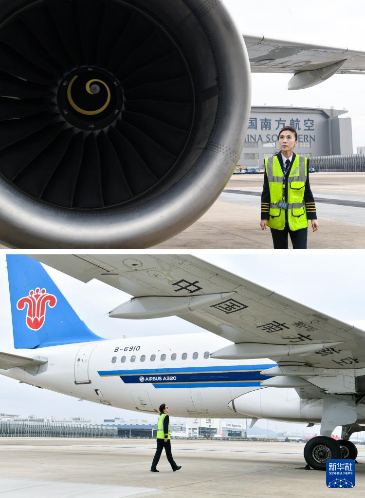 这是一张拼版照片:上图为3月5日,徐砚秀在深圳宝安国际机场停机坪进行飞行前的绕机检查(新华社记者毛思倩摄);下图为3月5日,刘洢含在深圳宝安国际机场停机坪进行飞行前的绕机检查(新华社记者梁旭摄)。