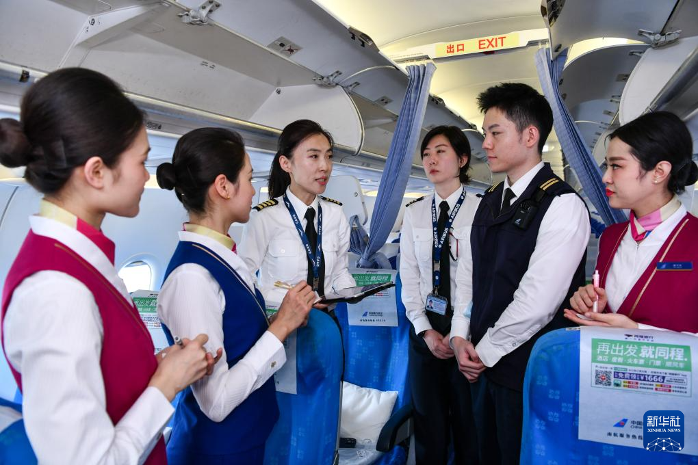 徐砚秀(左三)和刘洢含(右三)与乘务组举行飞行前的协作会议(3月5日摄)。