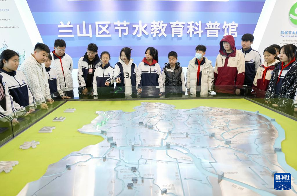 3月20日,在山东省临沂市兰山区节水教育科普馆,学生们了解当地水系分布情况。