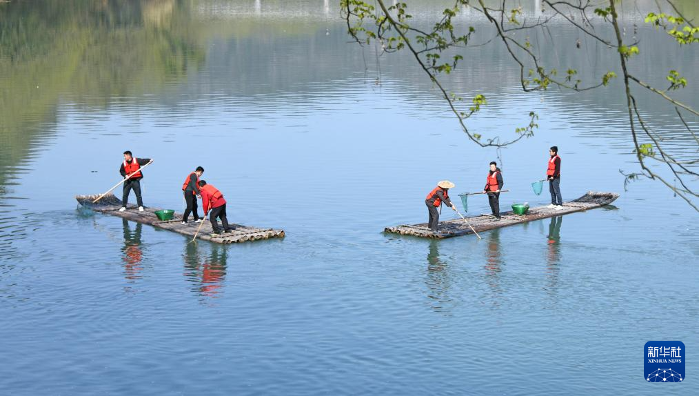3月20日,浙江省台州市仙居县步路乡党员志愿者与河长一起在永安溪巡河护水,清理杂物垃圾。