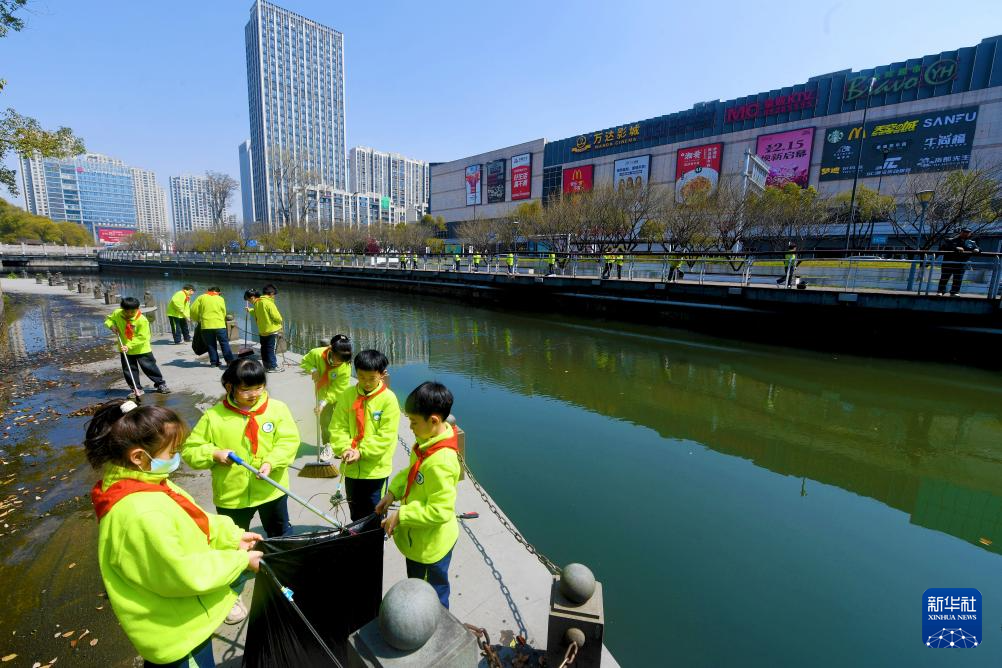 3月20日,在浙江省台州市路桥区路北街道蔡於泾河,南官小学的学生们在河岸捡垃圾、清理卫生。