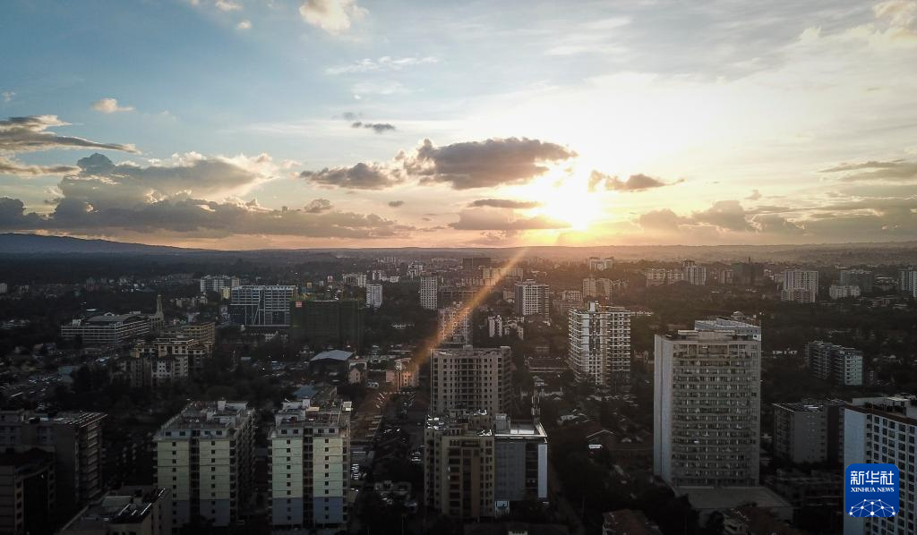 这是4月3日在肯尼亚首都内罗毕拍摄的城市日落时段风景(无人机照片)。