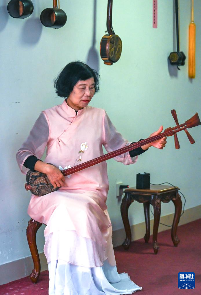 4月10日,在泉州中山路,一名当地居民学习南音弹唱。