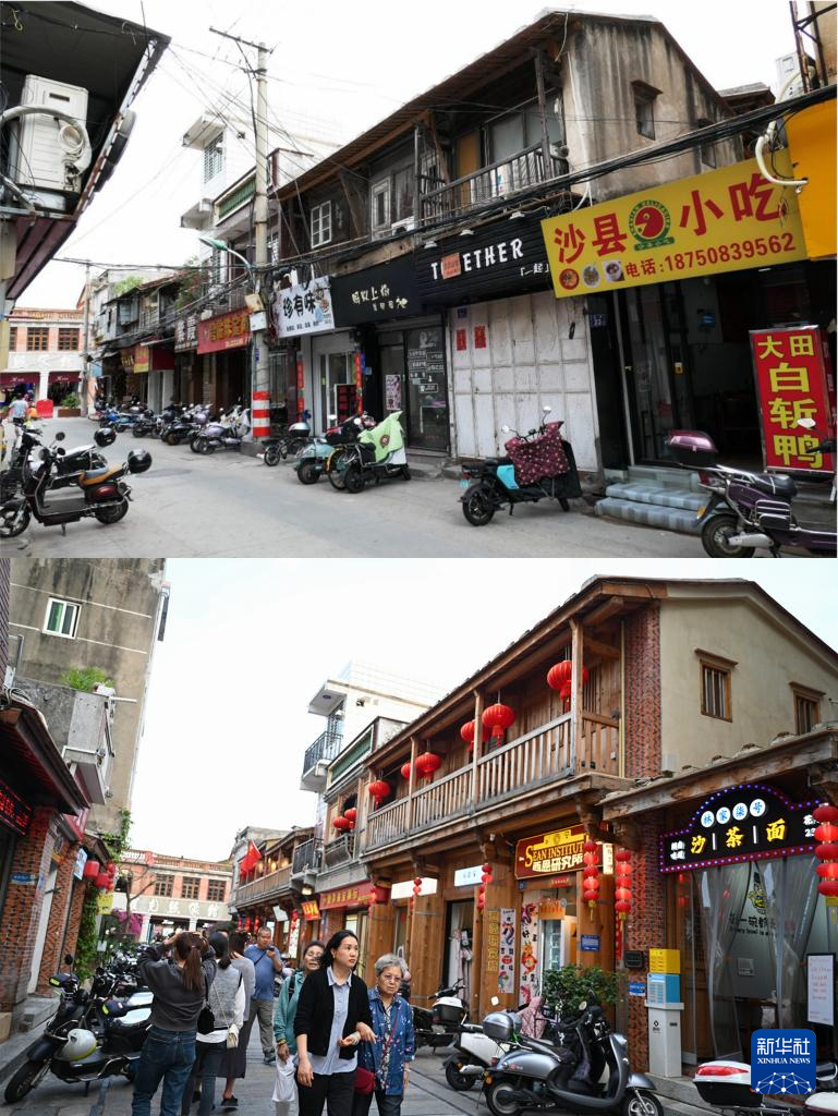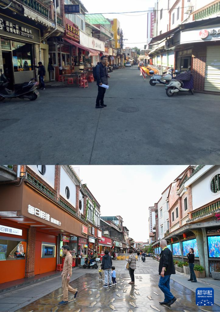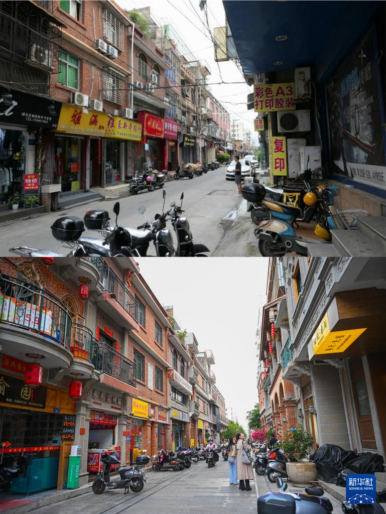 拼版照片:上图为中山路传统商业区改造前的街景(资料照片);下图为同一地点改造后的街景(4月10日摄)。
