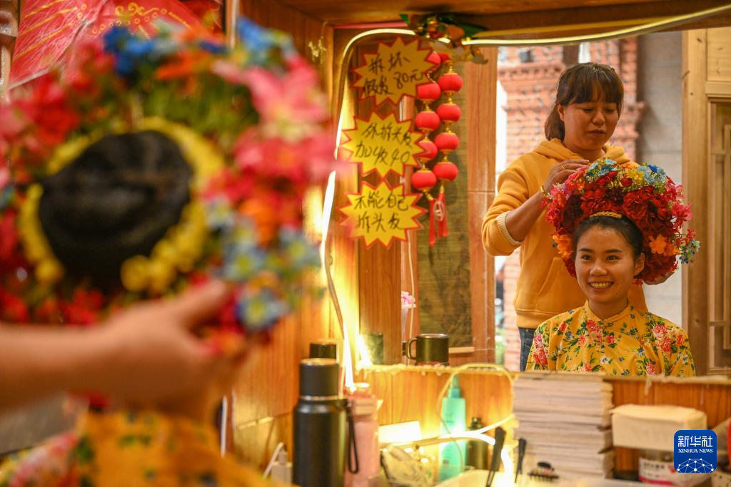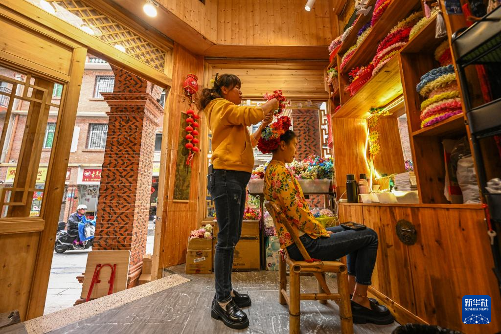 4月10日,在泉州中山路的一家蟳埔女簪花围体验店,老板为游客簪花。蟳埔女簪发戴花的古老民俗被称为“簪花围”。2023年初,网络上掀起“簪花围”热潮,各地游客慕名前来体验。