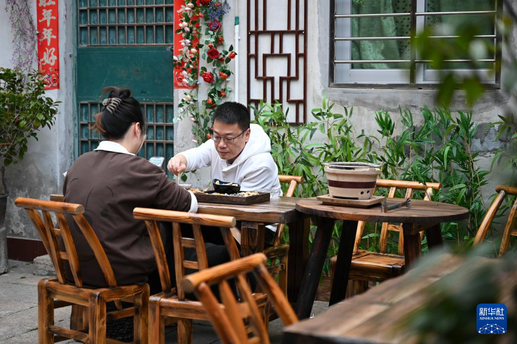 4月10日,游客在泉州中山路的一处庭院内喝茶、品尝小吃。
