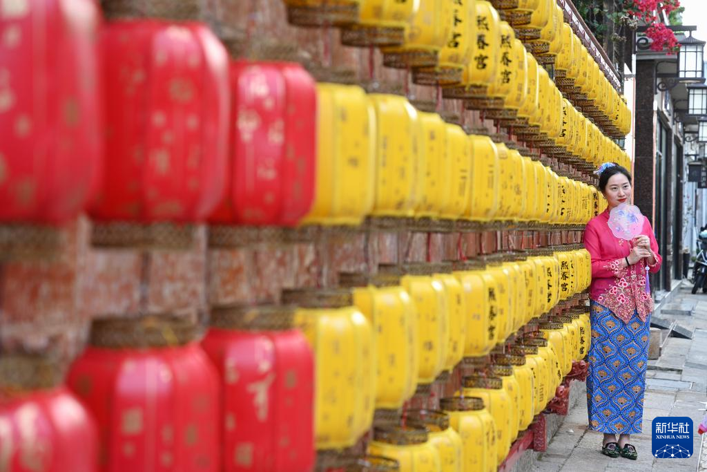 4月10日,游客在泉州中山路的一处挂满花灯的墙壁前拍照。