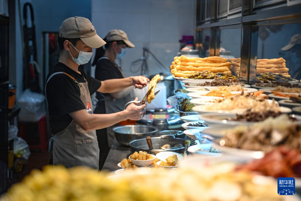 4月10日,在泉州中山路的一家传统老字号店铺里,工作人员制作美食。