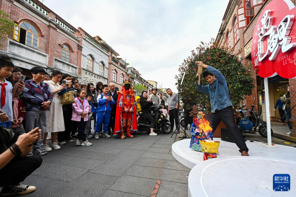 4月10日,在泉州中山路,游客观看变脸表演。