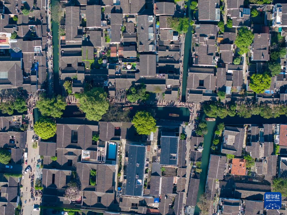 游客在苏州平江历史文化街区休闲游玩(4月18日摄,无人机照片)。