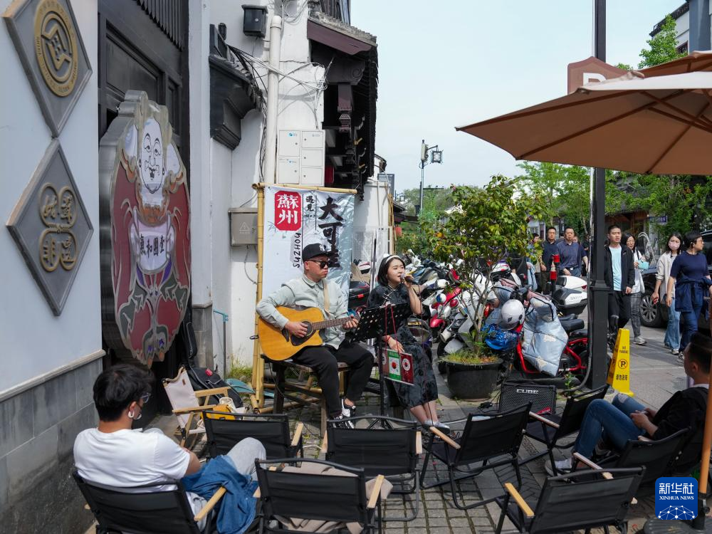 4月20日,游客在苏州平江历史文化街区休闲游玩。