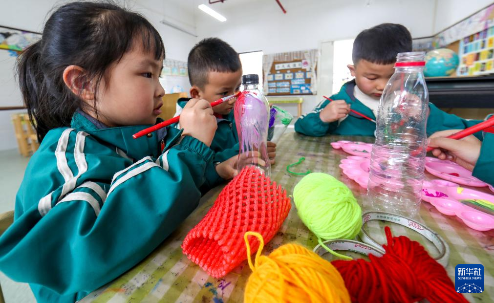 4月22日,贵州省开阳县第二幼儿园的孩子用废弃塑料瓶制作手工艺品。