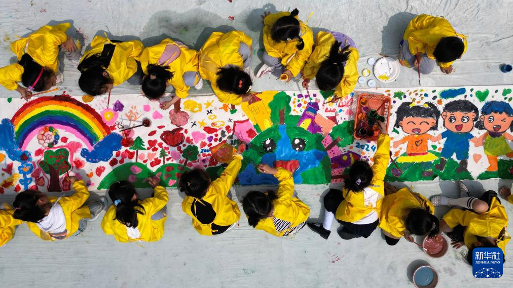 4月22日,贵州省铜仁市玉屏侗族自治县实验幼儿园的小朋友在世界地球日主题教育活动中画画(无人机照片)。