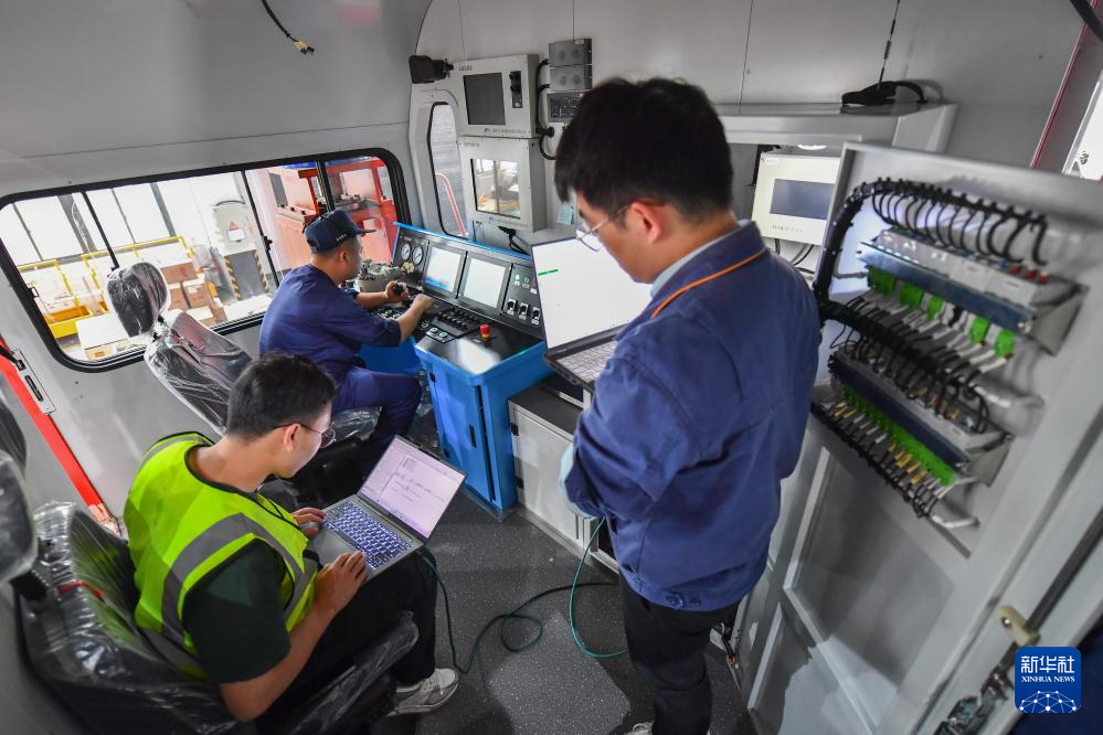 4月26日,在湖南株洲联诚集团控股股份有限公司新产业事业部车间,工作人员在检查新能源机车运行情况。