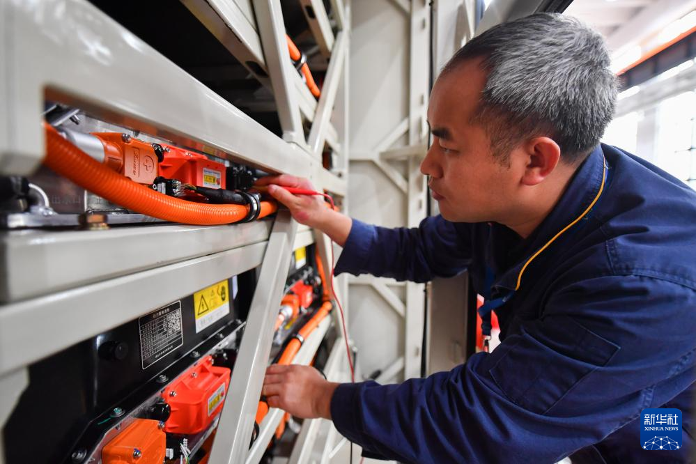 4月26日,在湖南株洲联诚集团控股股份有限公司新产业事业部车间,工作人员在检查新能源机车的电池组。