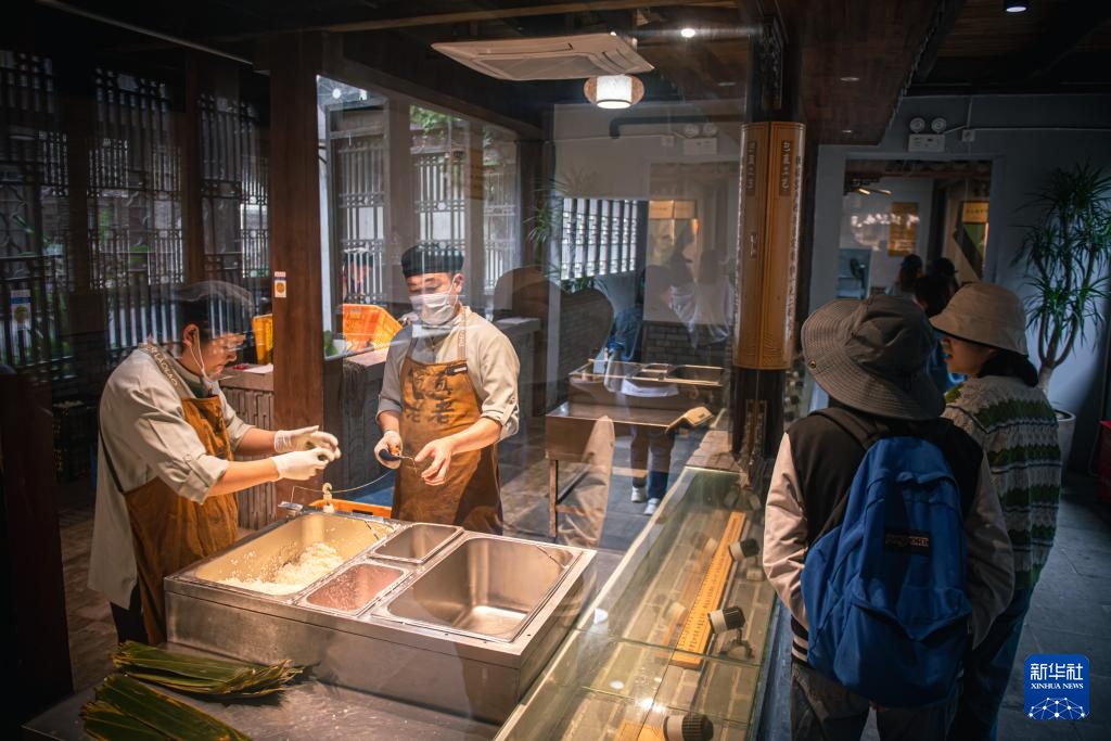 4月26日,游客在嘉兴市月河历史街区嘉兴粽子文化博物馆参观粽子制作过程。