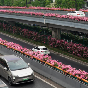 近日,杭州高架道路两侧种植的月季花渐次绽放,形成“空中花廊”,车行其中,美不胜收。