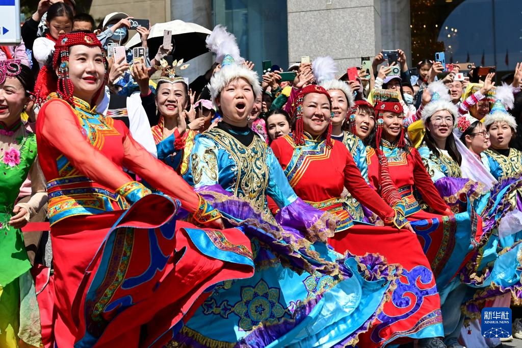 4月30日,在新疆乌鲁木齐市举行的巡游活动上,市民和游客一起跳麦西来甫。