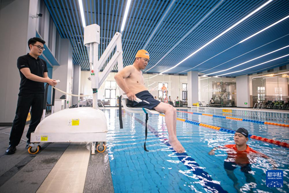 5月16日,残疾人在工作人员(左)协助下使用无障碍泳池升降机进入河庄文体中心无障碍游泳馆泳池。