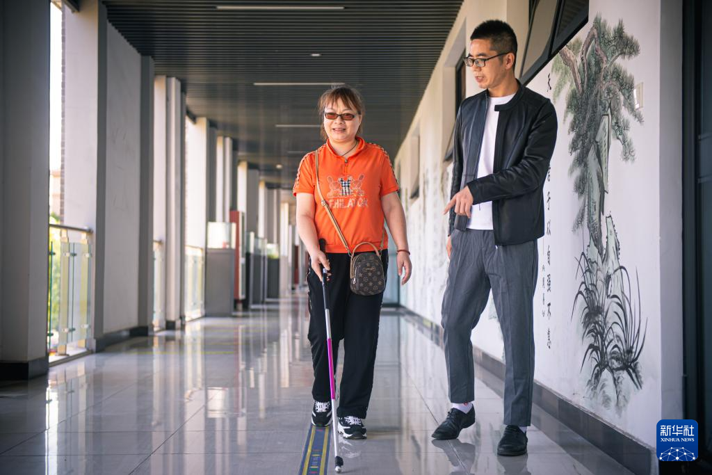 5月16日,杭州市钱塘区无障碍促进会工作人员(右)为首次来到河庄文体中心体验的盲人讲解电子盲道的使用方法。