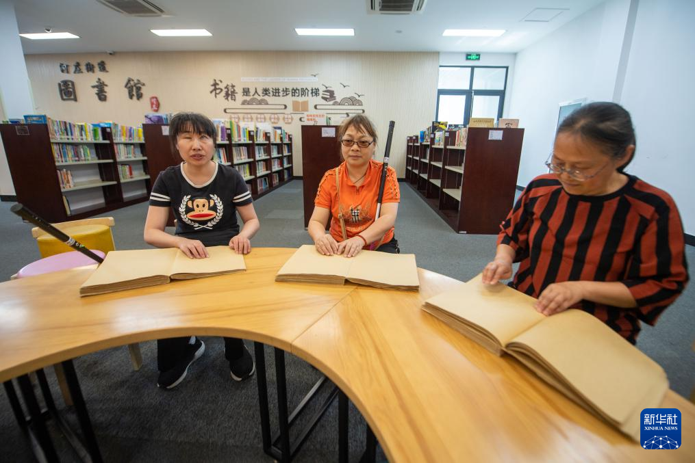5月16日,盲人在河庄文体中心图书馆内阅读盲文书籍。