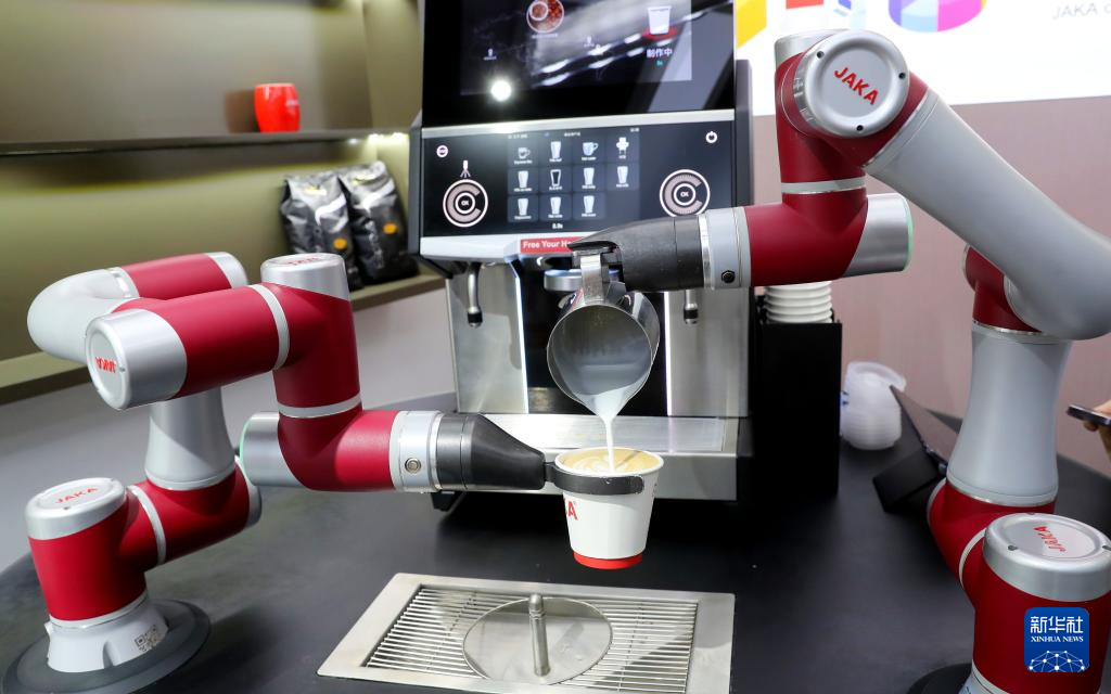 5月24日,在节卡机器人股份有限公司上海展厅,机器人在表演调制咖啡。
