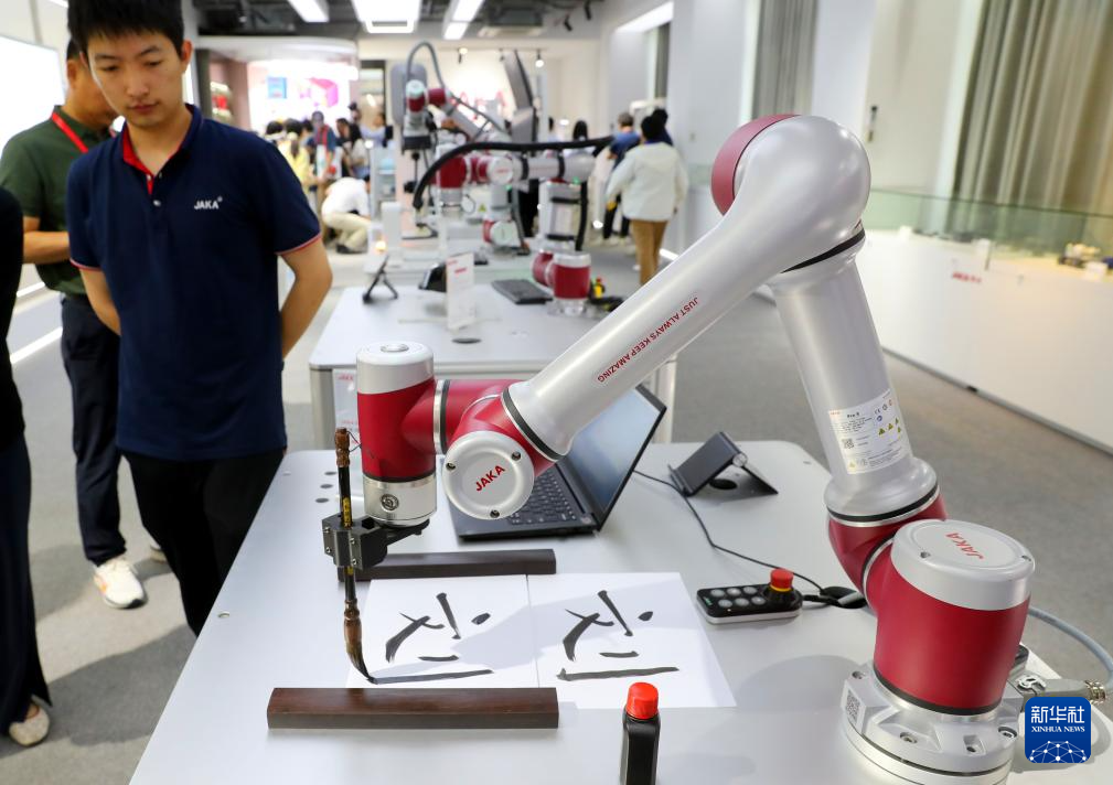5月24日,在节卡机器人股份有限公司上海展厅,机器人在表演写毛笔字。