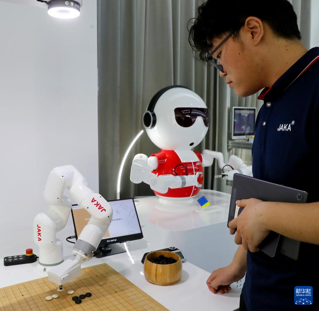 5月24日,在节卡机器人股份有限公司上海展厅,机器人与工作人员对弈五子棋。