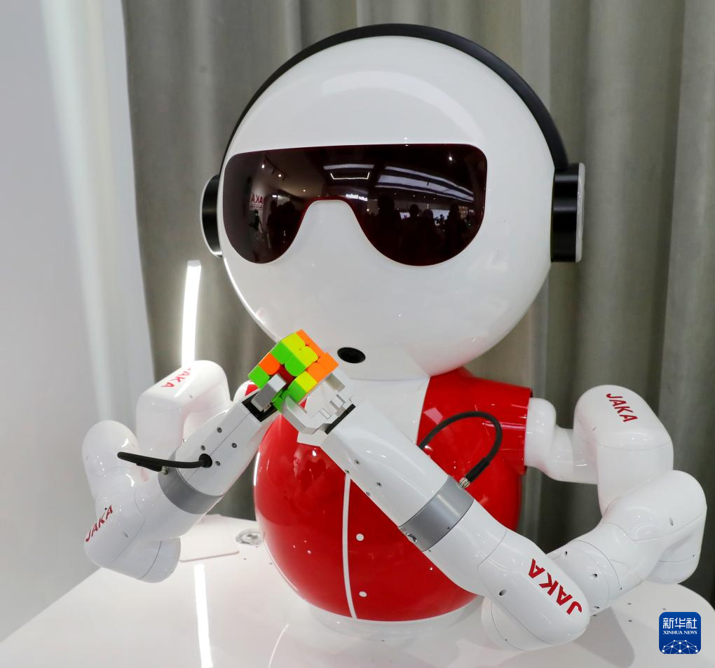 5月24日,在节卡机器人股份有限公司上海展厅,机器人在表演玩魔方。