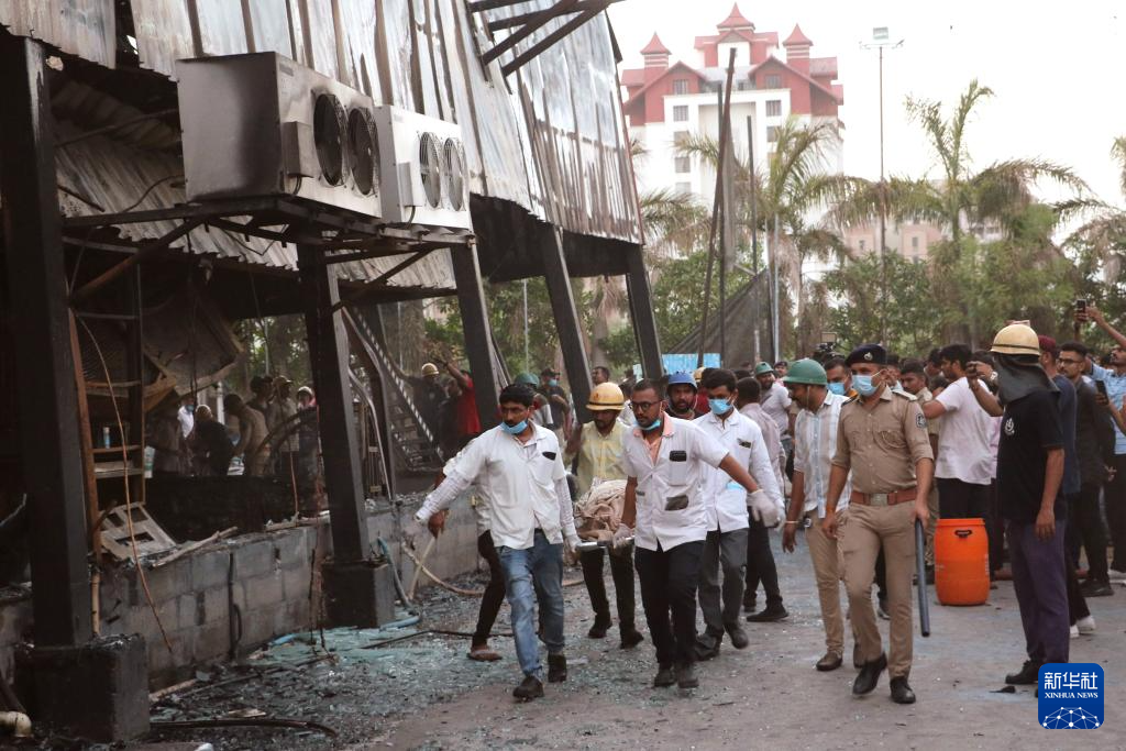 5月25日,救援人员在印度古吉拉特邦拉杰果德市的火灾现场转运遇难者。