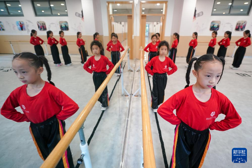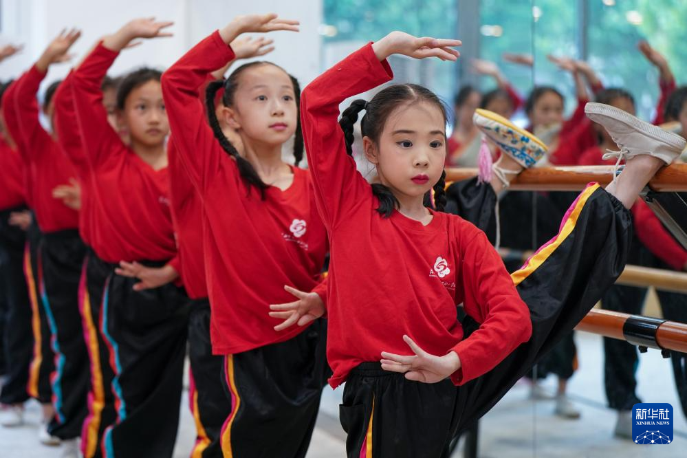 解苏倩(右一)和同学们在进行基本功训练(5月30日摄)。