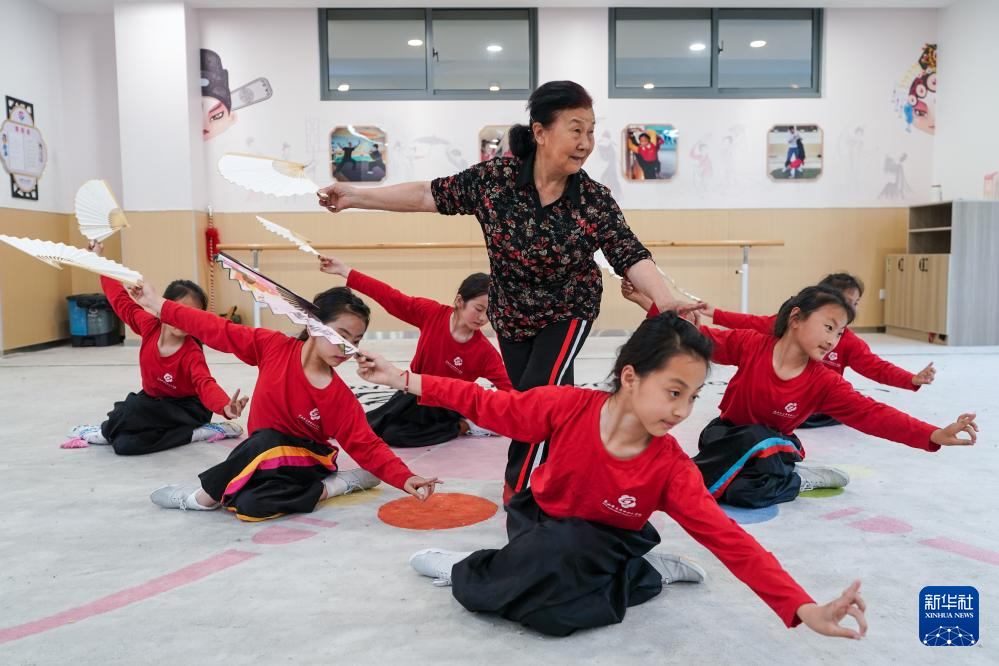 昆曲老师吴美玉(中)带着小昆班的学员们进行扇舞训练(5月30日摄)。