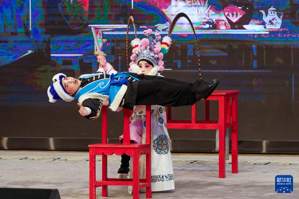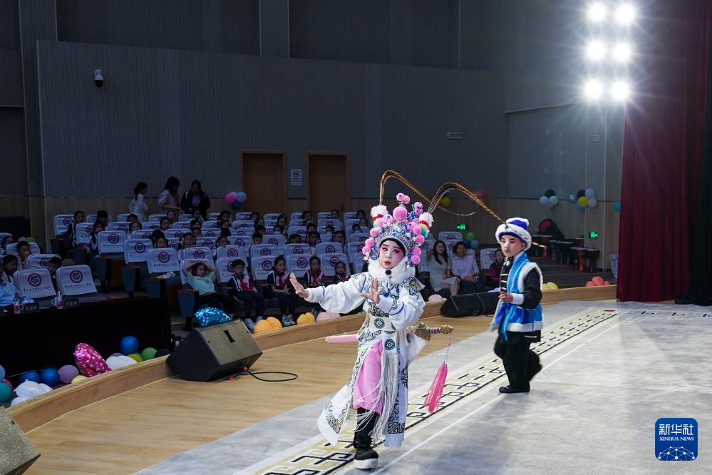 小昆班学员张梓轩和解苏倩(后)在表演昆曲剧目《挡马》。今年9岁的解苏倩是石牌中心小学校三年级的学生,从一年级进入小昆班以来,她在昆曲老师的教导下,系统学习“四功五法”,在“唱、念、做、打”四项基本功上狠下功夫,现在已经可以和同学们进行一些昆曲剧目的表演(5月31日摄)。