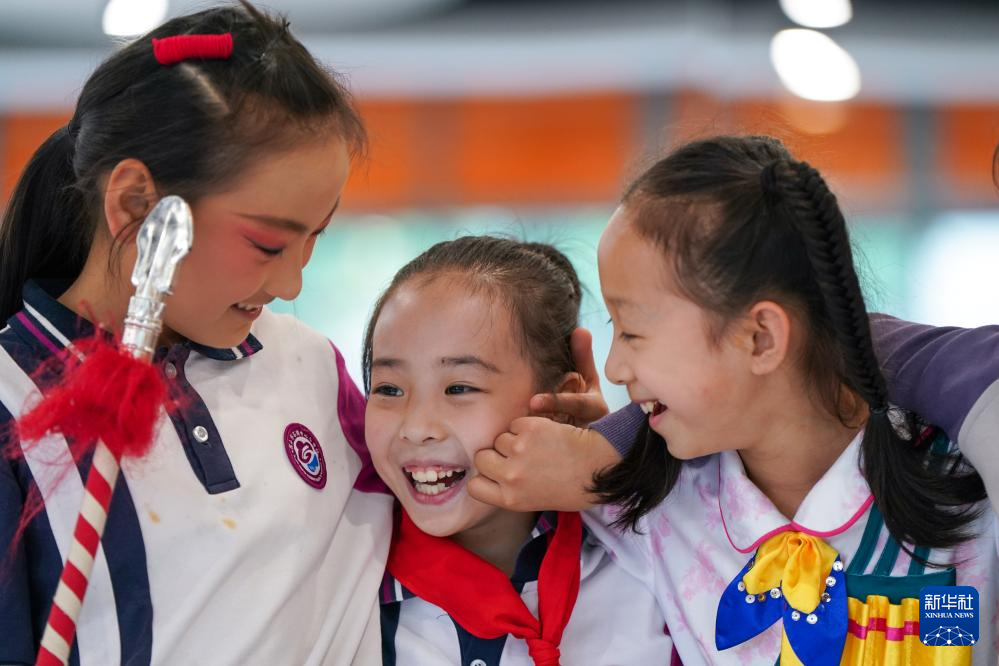 小昆班学员解苏倩(中)和同学们在一起游戏。今年9岁的解苏倩是石牌中心小学校三年级的学生,从一年级进入小昆班以来,她在昆曲老师的教导下,系统学习“四功五法”,在“唱、念、做、打”四项基本功上狠下功夫,现在已经可以和同学们进行一些昆曲剧目的表演(5月31日摄)。