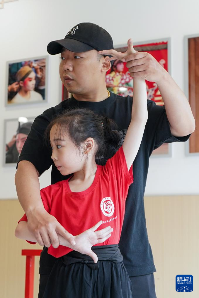 小昆班专职老师周杰(右一)在指导解苏倩(中)和张梓轩进行昆曲剧目专项表演训练。今年9岁的解苏倩是石牌中心小学校三年级的学生,从一年级进入小昆班以来,她在昆曲老师的教导下,系统学习“四功五法”,在“唱、念、做、打”四项基本功上狠下功夫,现在已经可以和同学们一起进行一些简单剧目的表演(5月26日摄)。