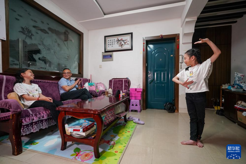 小昆班学员解苏倩(右一)在家里给爸爸和姐姐表演昆曲。今年9岁的解苏倩是石牌中心小学校三年级的学生,从一年级进入小昆班以来,她在昆曲老师的教导下,系统学习“四功五法”,在“唱、念、做、打”四项基本功上狠下功夫,现在已经可以和同学们进行一些昆曲剧目的表演(5月30日摄)。