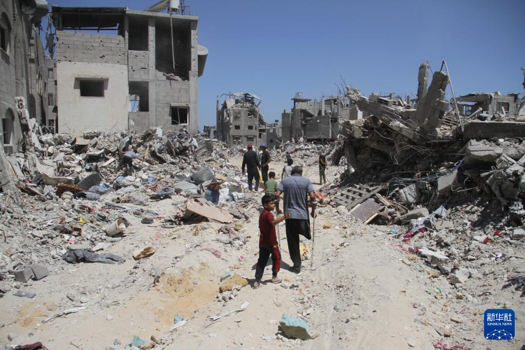 5月31日,在加沙地带北部杰巴利耶难民营,人们走过废墟。