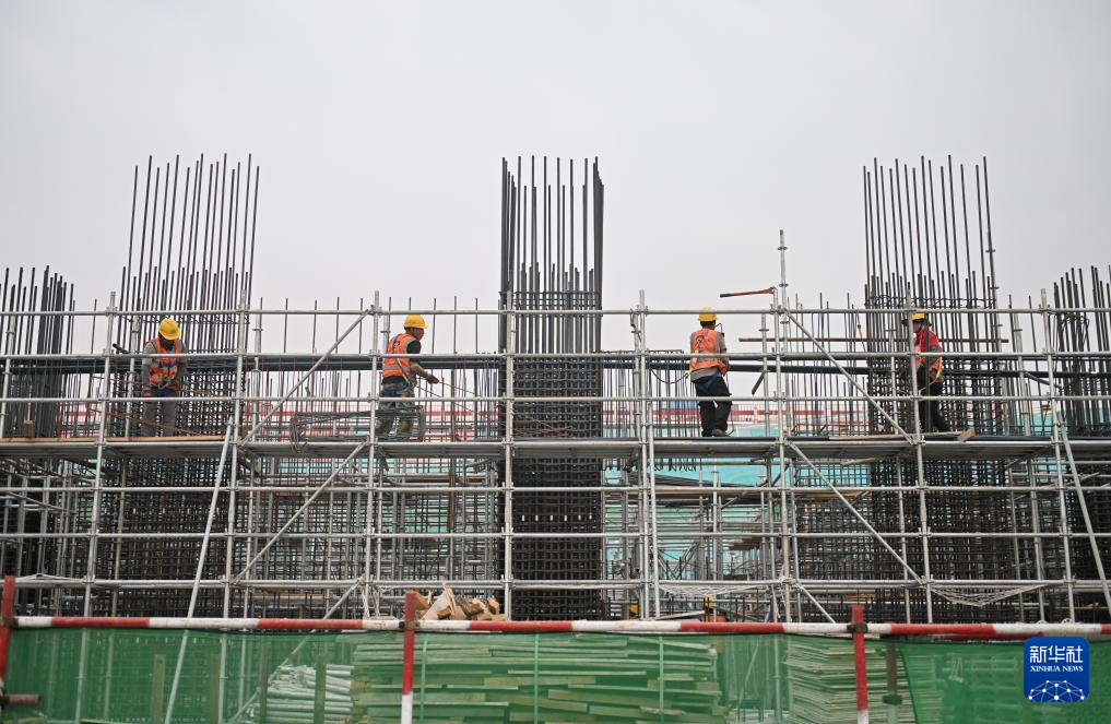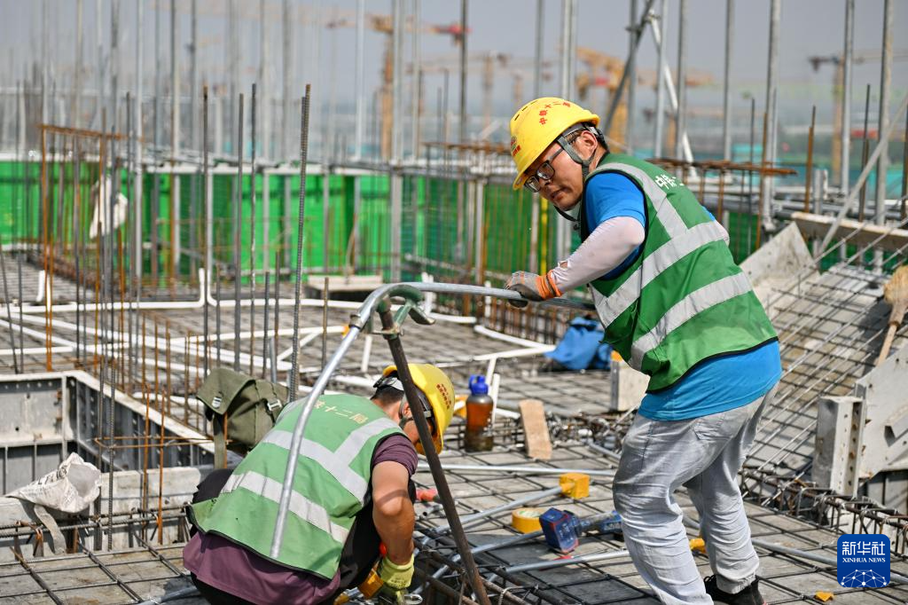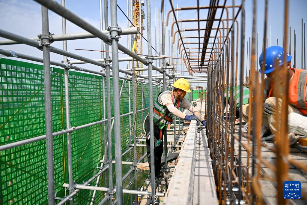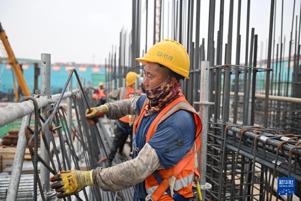 6月13日,在雄安新区启动区,中国建筑股份有限公司工人在雄忻高铁雄安地下段及相关配套工程四标段建设现场搬运钢筋。