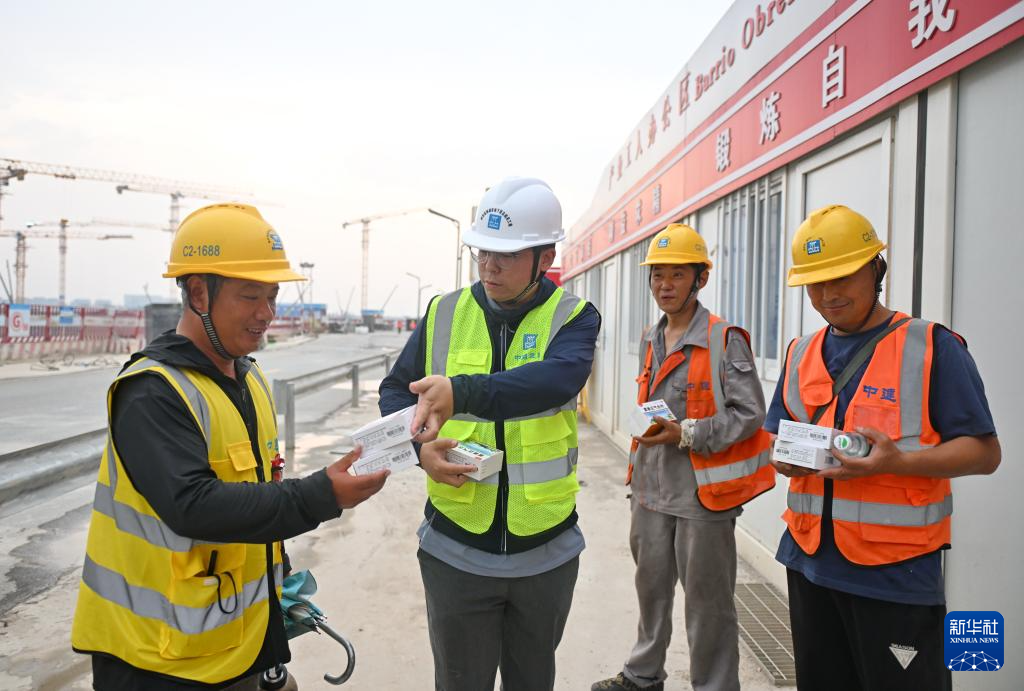 6月13日,在位于雄安新区启动区的雄忻高铁雄安地下段及相关配套工程四标段项目工地,中国建筑股份有限公司工作人员在给工人发放防暑物品。