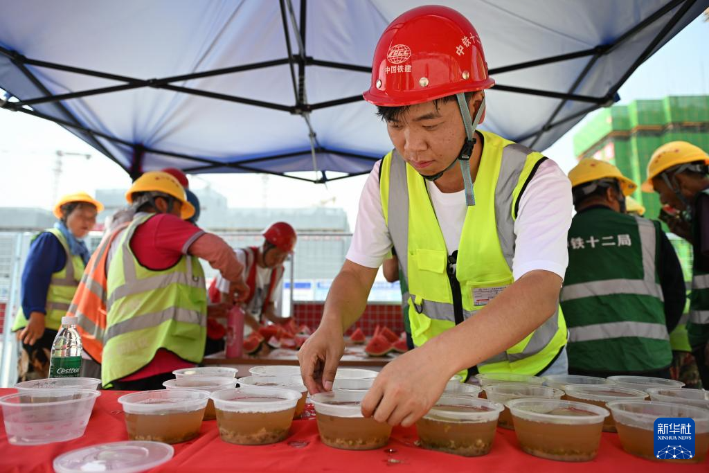 6月13日,在雄安新区大河片区安置房及配套设施项目建设现场,中铁十二局工作人员在整理准备发放给工人的绿豆汤。