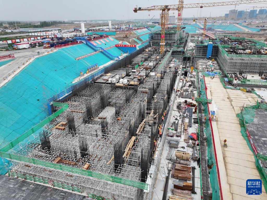 6月13日,在雄安新区启动区,中国建筑股份有限公司工人在雄忻高铁雄安地下段及相关配套工程四标段建设现场作业。